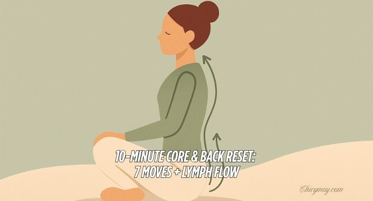 When your back whispers and your core feels “off,” you don’t need an hour – you need a smart ten. This 10-minute core and back reset uses seven floor-friendly moves that stabilize your spine, wake deep abdominal support, and end with a 60-second light lymph flow finisher. No equipment, no intensity spikes – just steady control you can repeat daily.