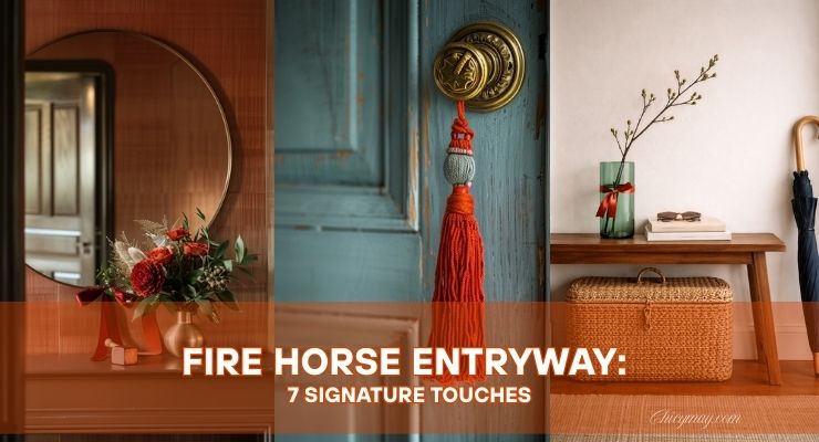 An entry can whisper a whole story in one glance. For a fire horse entryway, think equestrian-inspired shapes and disciplined color: a vermilion line that moves like a brushstroke, soft gold hardware with stirrup curves, a jade echo in glass or ribbon work, and ink/navy as the steadying note. The goal isn’t theme-park décor — it’s editorial calm with subtle “horse” cues: a rosette ribbon, a D-ring detail, a small sculptural silhouette. Clean air around each element makes it look intentional and photogenic.
