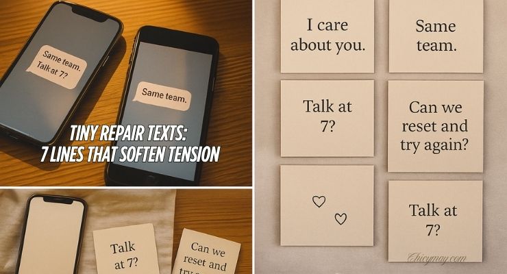 Repairs aren’t about winning – they’re about returning to warmth. Keep a few tiny repair texts saved, choose one that fits the moment, and pair it with a small next step (time, place, or topic). Small, steady mends build trust over time.