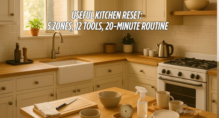 Your kitchen should cook for you – even on tired nights. This useful kitchen reset maps five simple zones, trims your tool kit to twelve things you’ll actually use, and ends with a 20-minute routine that keeps counters clear and mornings kind.