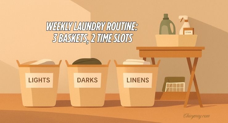 Laundry isn’t hard – it’s just constant. A simple weekly laundry routine turns an endless loop into two predictable windows you can keep even on busy weeks. You’ll use three baskets (Lights, Darks, Linens) and two time slots (Wash, Finish). The goal isn’t perfection; it’s flow: fewer piles on chairs, fewer “where are my socks?” mornings, and a calm closet that quietly refreshes.
